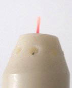 | 老人性の「イボ」取り中です。ピンセットで「イボ」をつまんで、チカッと一秒ほど焼き切ります。他の皮膚病としては「ニキビ」「ホクロ」「ヘルペス」痔核」「湿しん」などの患者さんが多いそうです。意外な事に傷跡は日にちが経つと全然残らないと言っていました。 | 焼いた跡は小さな火傷として残っています。この跡に化膿止めの軟膏を塗り、綿花を当てた上に絆創膏で貼り止めます。この治療は治療後のフォローが大事ですね。右の写真は通電で赤くなった先端部です。先端の針は皮膚に刺さるのではなく、皮膚に触れた途端にバネで内部に引っ込む様になっています。 | |